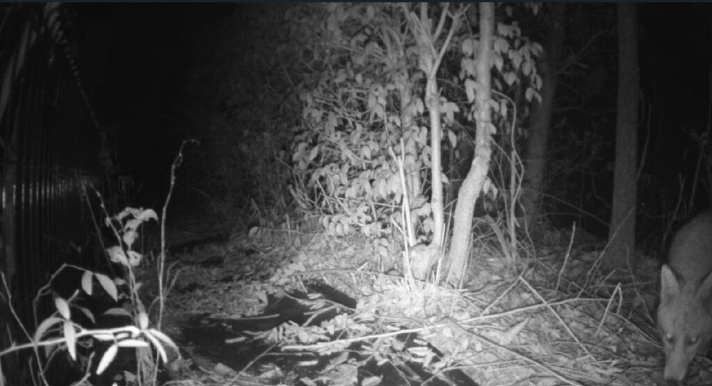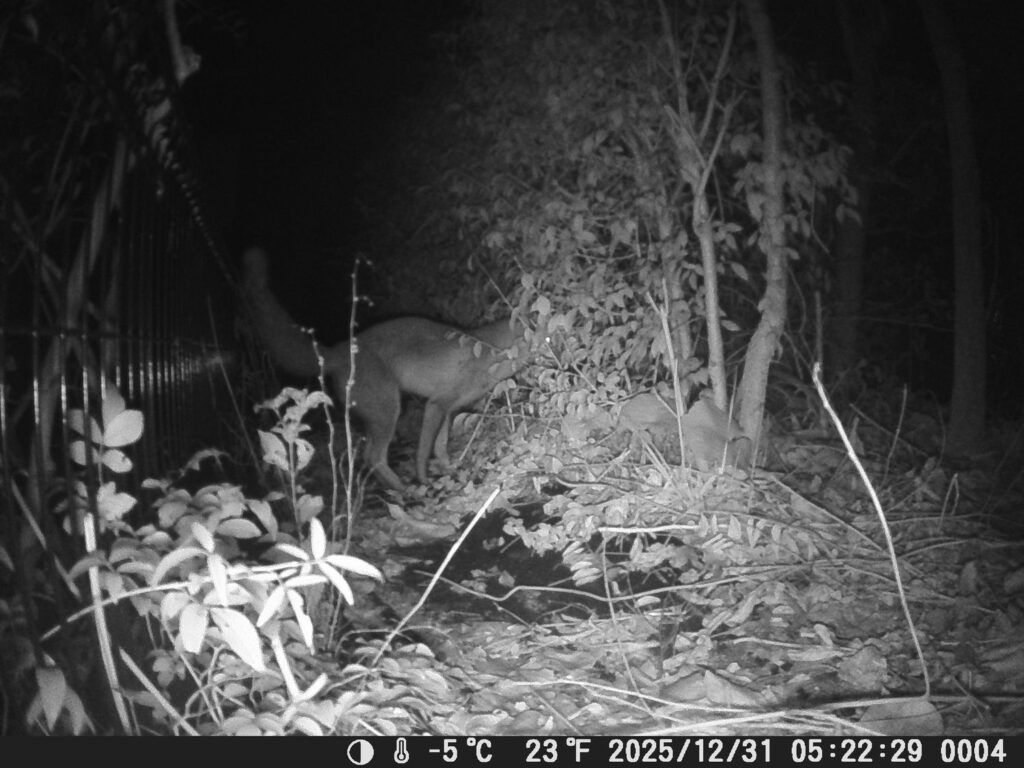 園内で目撃されたキツネ。タヌキやハクビシンはよく見かけるが、キツネが見られたのは初めて。武蔵野市内でキツネが見られるとは。